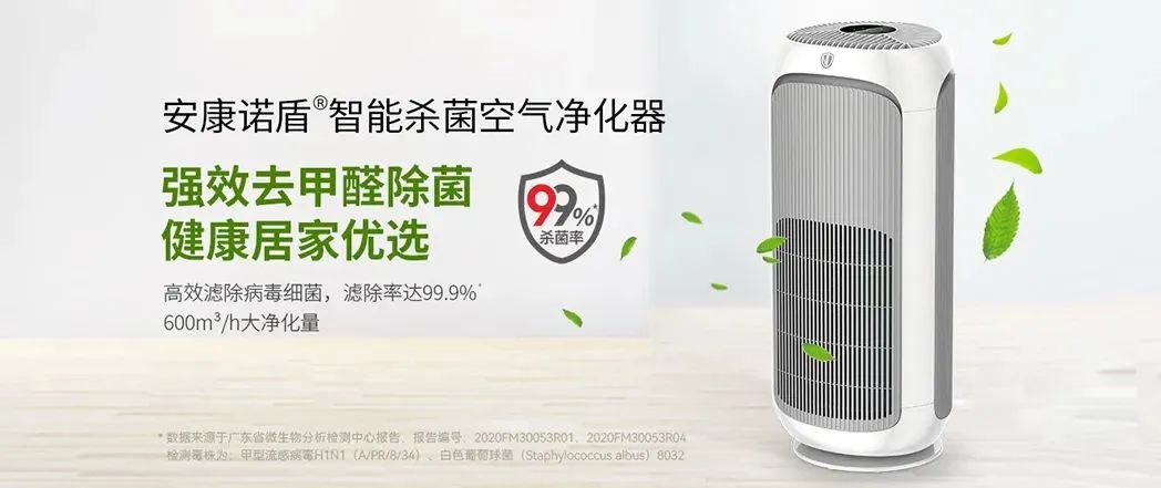 安康諾盾智能殺菌空氣凈化器,擁有高達600m3/h(顆粒物)+150m3/h(甲醛)的CADR值,針對35-60m3的房間,實現空氣凈化只需5分鐘。