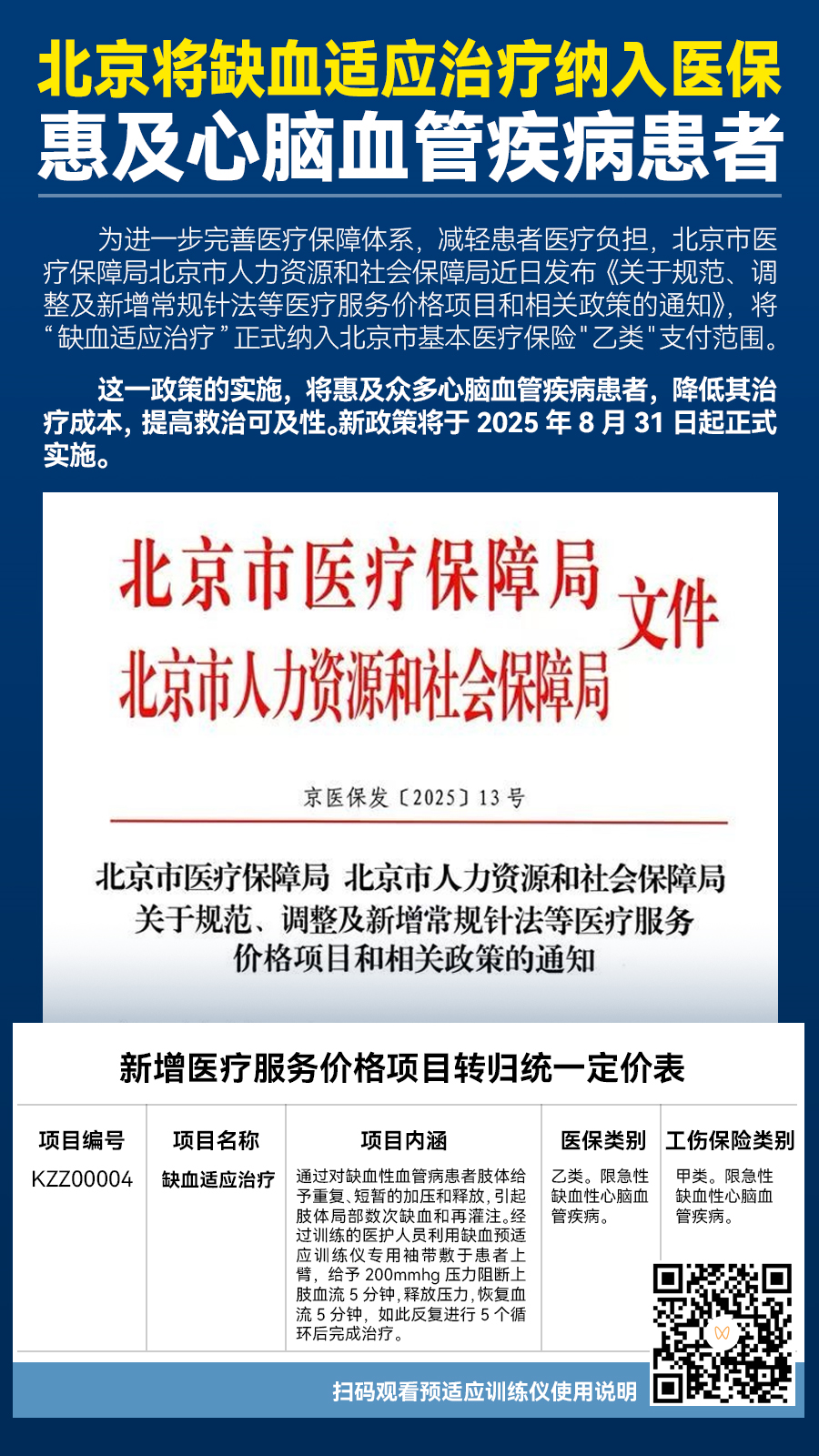 為進一步完善醫療保障體系,減輕患者醫療負擔,北京市醫療保障局北京市人力資源和社會保障局近日發布《關于規范、調整及新增常規針法等醫療服務價格項目和相關政策的通知》,將“缺血適應治療”正式納入北京市基本醫療保險"乙類"支付范圍。